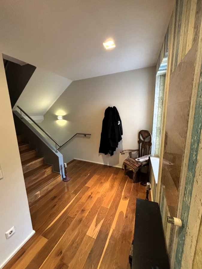 Situé dans un quartier exclusivement résidentiel très tranquille, au 1er et 2ème étage de la maison bi familiale rénovée en totalité récemment, Beau et Grand Duplex de +/- 148 m2, comprenant :- Hall d'accueil.
