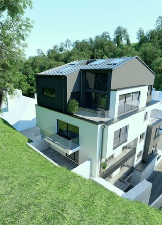 Finitions haut de gamme : Triple vitrage + volets électriques / VMC individuelle (ventilation mécanique contrôlée) / chaudière à pompe à chaleur et chauffage par le sol / peinture intérieure incluse.