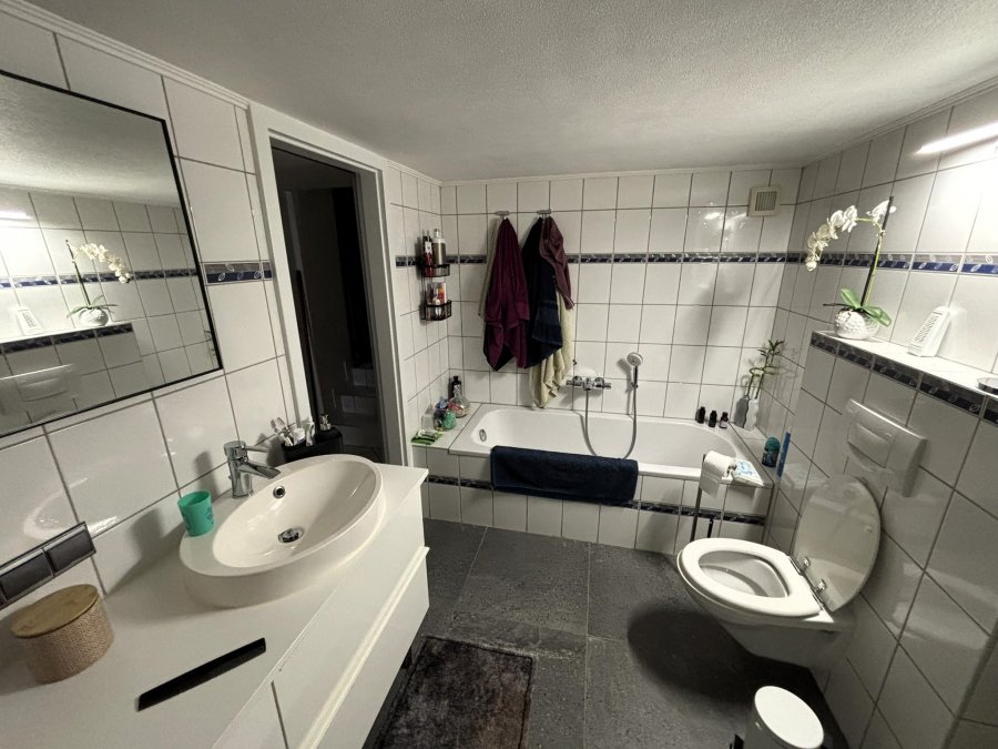 - Salle de bain avec douche, baignoire, lavabo et WC.