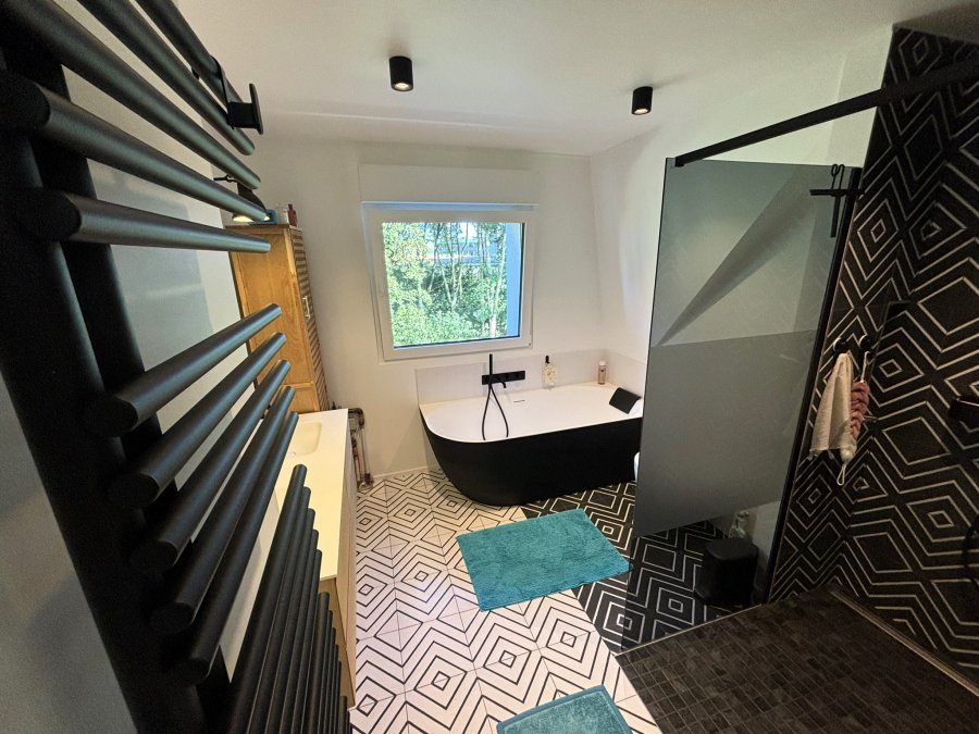 - Salle de bains principale comprenant baignoire, douche "italienne", double lavabo et toilette.