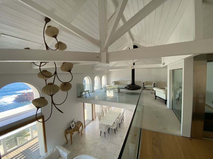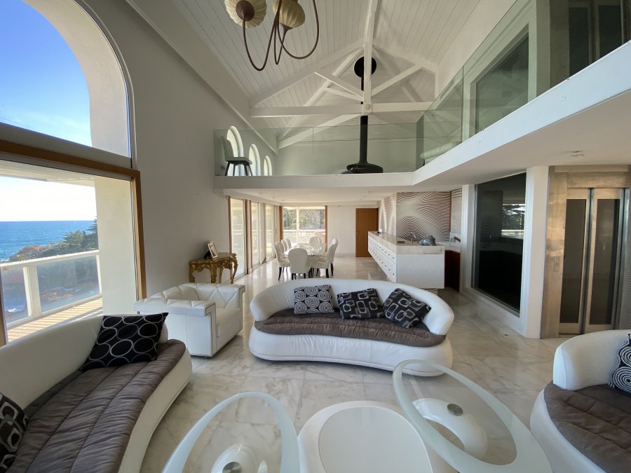 Le vaste espace de vie, de plain-pied, s'ouvre sur une terrasse panoramique offrant une vue spectaculaire sur la mer.